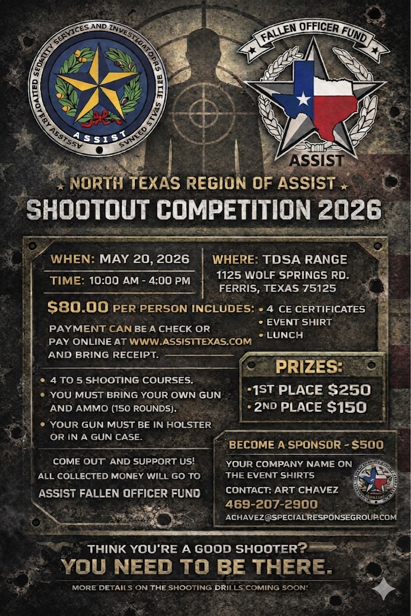 The ASSIST Shootout Competition 2026 is one day of competition, and fellowship among Texas private security and private investigations professionals. Come out and support us! All money collected will go to the ASSIST Fallen Officer Fund.